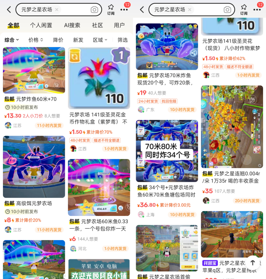 打开闲鱼搜索关键词“元梦农场”,跳出来的结果除了有一些零星售卖游戏道具的帖子外,几乎全部都是出售农场、渔场作物的“花农”和“鱼农”们,而他们出售自己农作物的价格也从个位数到十位数甚至上百不等。