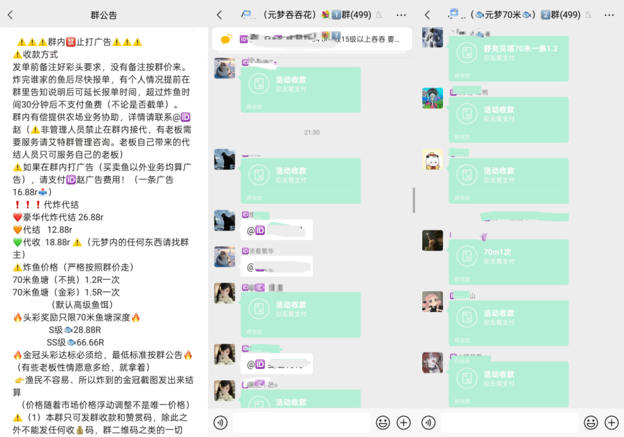 和第一梯队的高等级玩家相比,排在第二梯队、农作物价值没有那么高的花农就没有那么赚钱了。在某个炸鱼交易群中,时不时就有卖鱼的玩家询问,“有老板吗?60m炸鱼0.6元,70m炸鱼1.5元,莲花掌5元买断”,这或许才是主流普通玩家买卖农产品价格,这样的价格,俨然已经把普通“花农”成为了劳动力密集型服务的提供者。