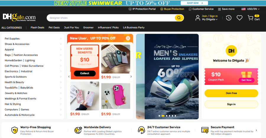官网显示,敦煌网提供超3300万种在线产品,涵盖电子产品、家居和玩具、鞋服、珠宝、健康和美容等类别。其注册买家超7700万、供应商超250万,覆盖225个国家和地区,拥有14个海外仓和188条物流线路。