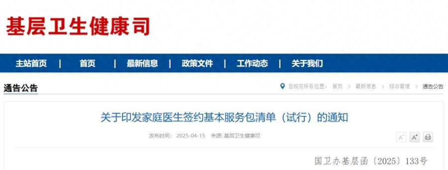 4月15日,国家卫生健康委员会印发《家庭医生签约基本服务包清单 (试行)》(以下简称《清单》),针对一般人群及老年人、慢性病患者、孕产妇、儿童、残疾人等重点人群,分类制定68项服务项目,通过“基础服务+个性服务”组合模式,进一步规范家庭医生签约服务内容,推动基层医疗卫生机构提供更精准、更有温度的健康管理服务。