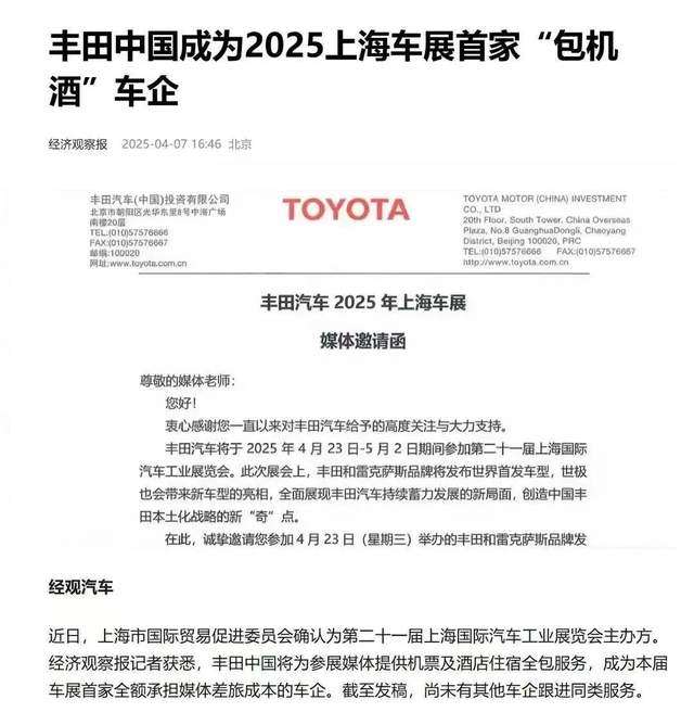 说的是丰田中国成为2025上海车展首家为车媒包“机酒”的车企。企业包机酒能成为新闻,这是我们作为财经科技圈媒体不能理解的。因为多年来,企业开发布会,为媒体负担“机酒”以及提供车马费,这是行业一直以来的惯例。