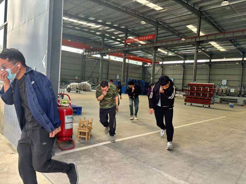 企业立即启动应急预案:安全员第一时间拉响警报,疏散组引导员工弯腰低姿、捂住口鼻,沿安全通道有序撤离;灭火组迅速使用灭火器控制火势。整个逃生过程紧张有序,20余名员工在1分钟内全部安全转移至指定集合点。随后,参演人员分批进行了灭火器实操训练,确保人人会操作、懂应对。