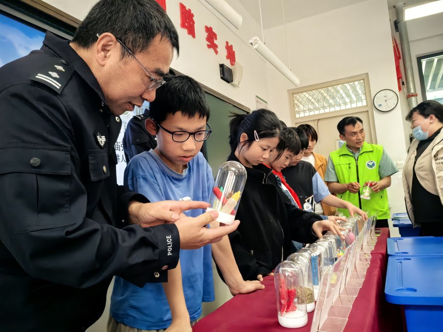 活动现场,气氛热烈非凡。禁毒民警与社工精心布置了禁毒宣传展台。形态逼真的禁毒模型整齐排列,直观展示了各类毒品的外观特征,让同学们对毒品有了更清晰的认识;内容丰富的宣传页,以图文并茂的形式,深入浅出地介绍了毒品的危害、种类以及预防方法;带有禁毒元素的小礼品,不仅实用,更时刻提醒着同学们远离毒品。