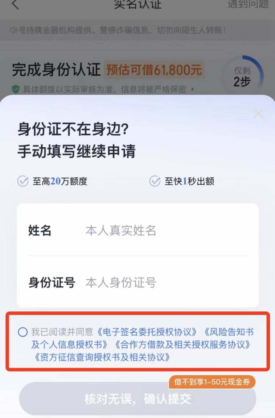 据消费日报网报道,记者尝试在“你我贷”App借款时,页面显示完成身份认证预估可借6.18万元,但在填写姓名、身份证号时,还须勾选同意《合作方借款及相关授信服务协议》等4份协议。而点进这4份协议后记者发现其中还内嵌了500多份协议。