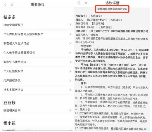 其中,和嘉银科技旗下的海南银科融资担保有限公司相关的担保协议内嵌在《风险告知书及个人信息授权书》里的5份合同之中。此外“你我贷”App还与其他网贷平台合作,为用户提供借款推荐服务。桔多多等这数十家合作方的服务协议包含在《合作方借款及相关授信服务协议》中,合计约545份。如《委托担保咨询服务协议》等相关的服务协议便“深藏”在这500多份协议中。