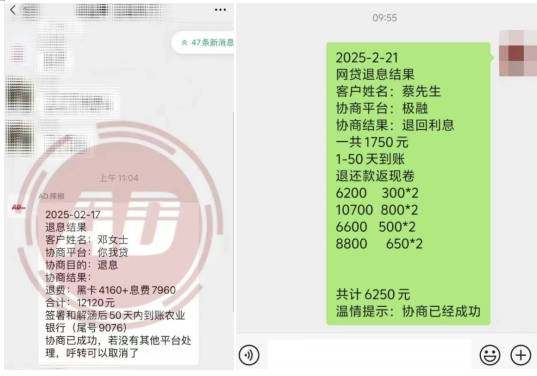 为了吸引潜在客户,广告中还挂出了近期多位客户协商退息退费成功的案例,显示协商成功后消费者收到了退还的现金或是还款返现券。