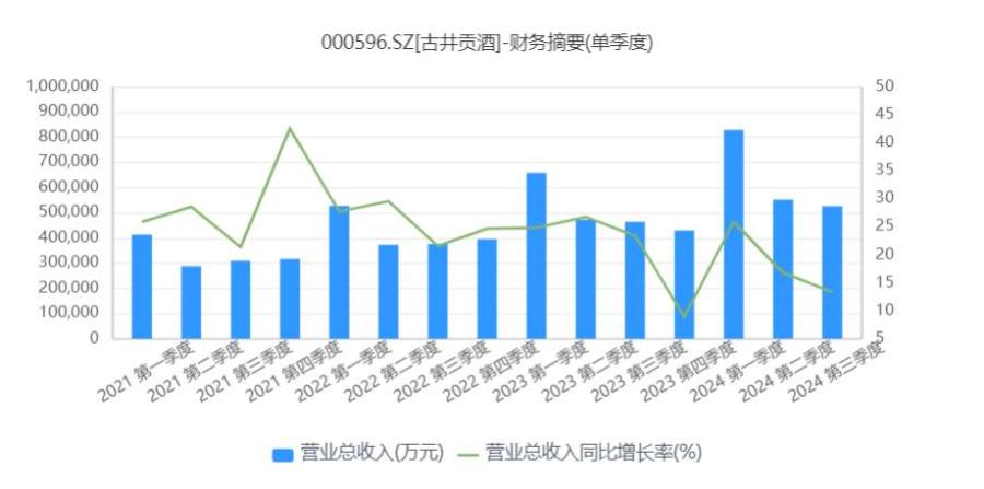细看古井贡酒2024年的季度财务报告,可以看到一个高开低走的趋势,先是第一季度营收增长25.85%,净利润增长31.61%;而后第二季度营收增速显著下降至16.8%,净利润增速为24.6%;第三季度两项指标更是进一步降至13.4%和13.6%。