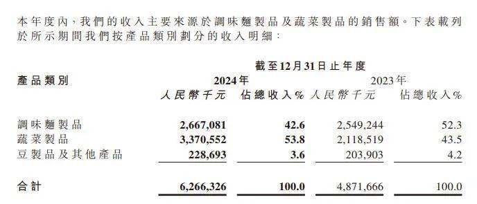 然而,2024年,卫龙美味实现收入62.66亿元。财报中,卫龙美味介绍,本集团坚持多品类的产品策略,涵盖了调味面制品、蔬菜制品、豆制品及其他产品品类。其中,调味面制品(俗称“辣条”)主要包括大面筋、小面筋、麻辣棒、小辣棒、亲嘴烧等。