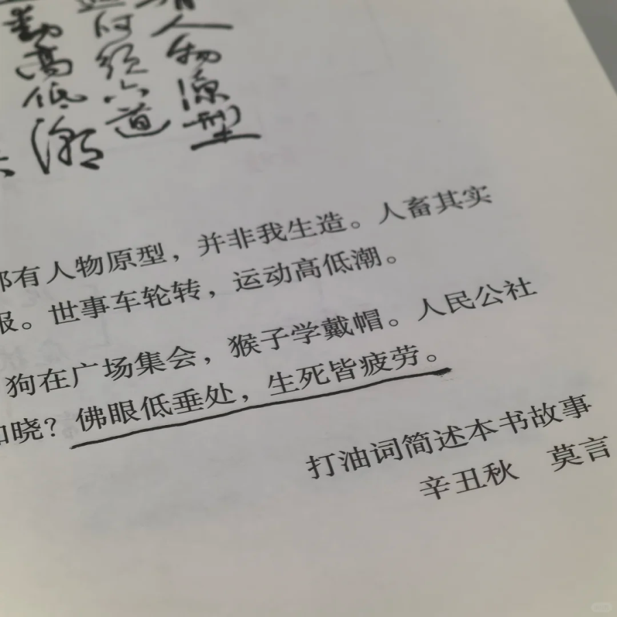 趁着世界读书日,我就试着用这几句话来聊聊这个问题吧。我当时接受记者采访的时候曾经说过,《生死疲劳》虽然草稿写了43天,但是这个故事在我头脑当中,已经存在了43年,一直找不到该如何下笔。