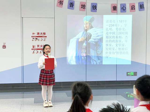 随后,队员代表通过自制的精美课件分享读书感悟。赵雅苹队员生动讲述了三国时期的历史故事;纪忻言队员介绍了我国航天事业的成就;刘念曦队员则讲述了书籍从甲骨文到电子书的演变历程。他们的分享吸引了众多乘客驻足倾听,现场气氛热烈。