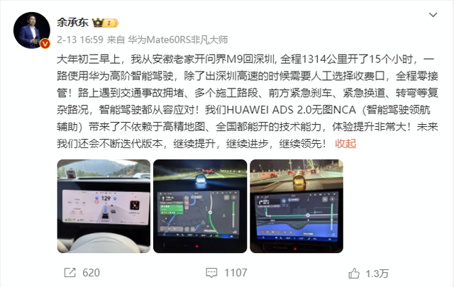 余承东的这条微博可谓是“激进派”的一个典型写照,去年2月,他宣称智驾可以脱手零接管,“1314公里,15个小时,使用华为高阶智能驾驶,全程脱手零接管……继续进步,继续领先!”