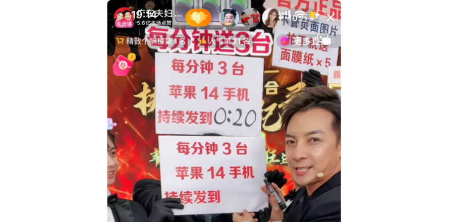 其中,在广东夫妇破纪录的专场直播中,他们喊出了“1分钟送3台苹果手机”的口号,在持续12小时的直播中,累计送出了5000台苹果手机,虽然打破了截至当日抖音家清单场直播的GMV纪录,但蝉妈妈数据显示的直播付费流量占比高达69%,营销投入甚至高过当日营收。