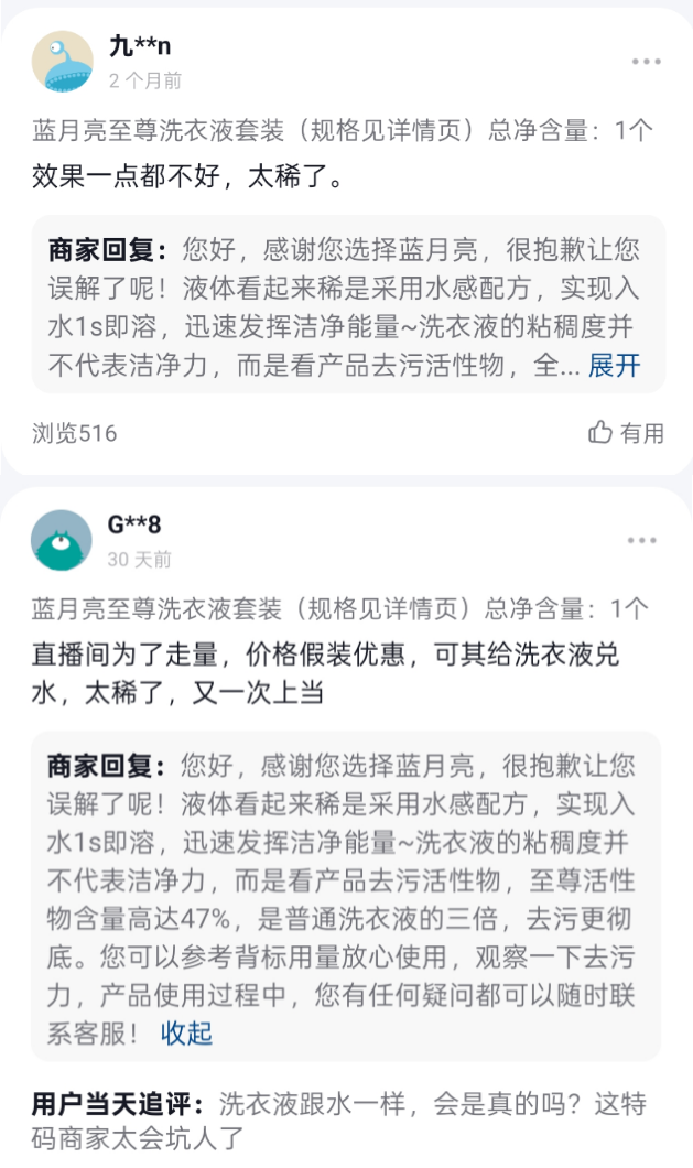 在商品评价中,一些消费者仍然给出了类似“效果一点都不好,太稀了”“直播间为了走量,价格假装优惠,可其给洗衣液兑水,太稀了,又一次上当”这样的差评。