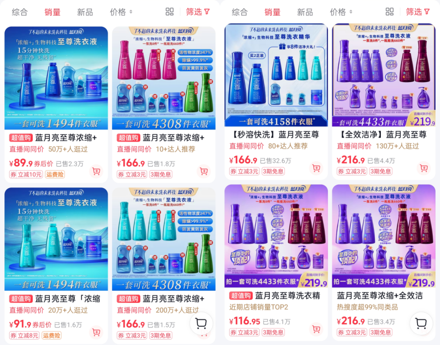 产品表现之外,具体到更细节一些的规格和出售打法上。蓝月亮直播间中动辄十瓶、十几瓶的至尊套装、起步就要几十元上百元的价格,在消费降级的当下,天然就劝退了很大一批潜在购买者。