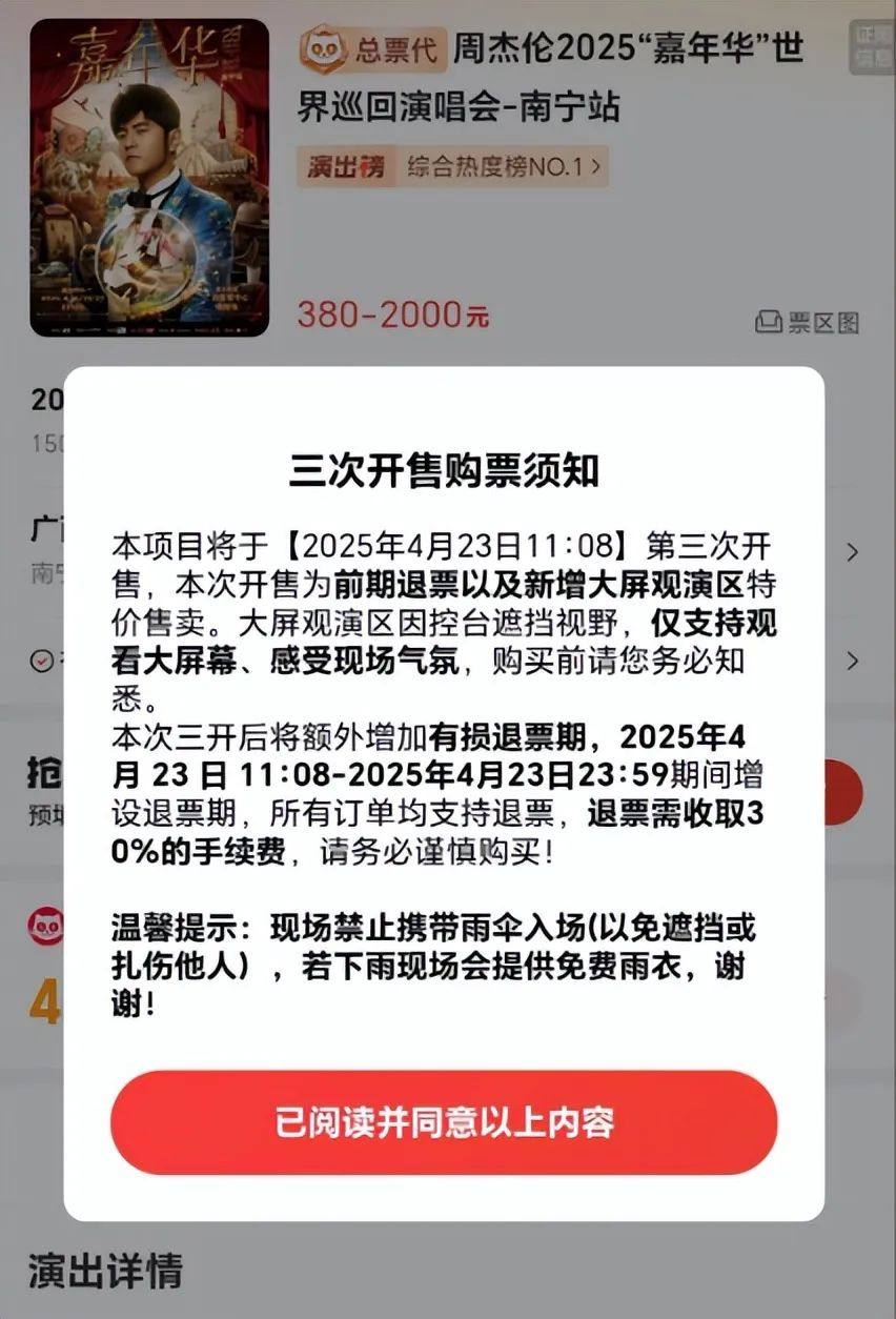据界面新闻消息,4月23日中午,周杰伦2025“嘉年华”世界巡回演唱会南宁站门票第三次开售,包含退票及新增的特价大屏观演区。