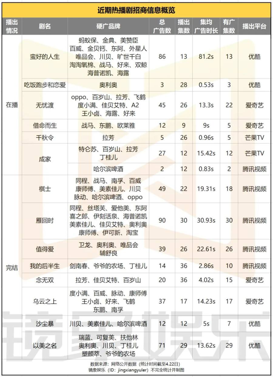先是在月初,腾讯视频的《雁回时》频频热度登顶,截至收官,该剧累计斩获90个广告,合作品牌多达13个。随后,《蛮好的人生》展现出强阵容的号召力,仅在优酷网端,该剧开播首日便拿到9个广告,单集广告时长接近120s,截至4月22日,《蛮好的人生》播出13集,累计广告数就已达到86广,合作品牌16个,大有领跑之势。并且,除了贴片硬广,该剧中的软植入,还覆盖到可口可乐、爱仕达、999感冒灵等7家品牌。