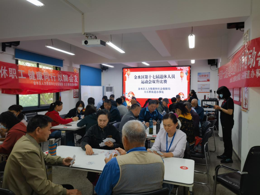 为丰富辖区企业退休人员的精神文化生活,搭建沟通交流平台,营造“老有所乐、老有所为”的和谐氛围,4月24日,大石桥街道联合金水区人力资源和社会保障局在同乐社区举办第十七届退休人员运动会双升比赛,吸引了金水区14个街道办事处共80余名企业退休人员参与比赛。