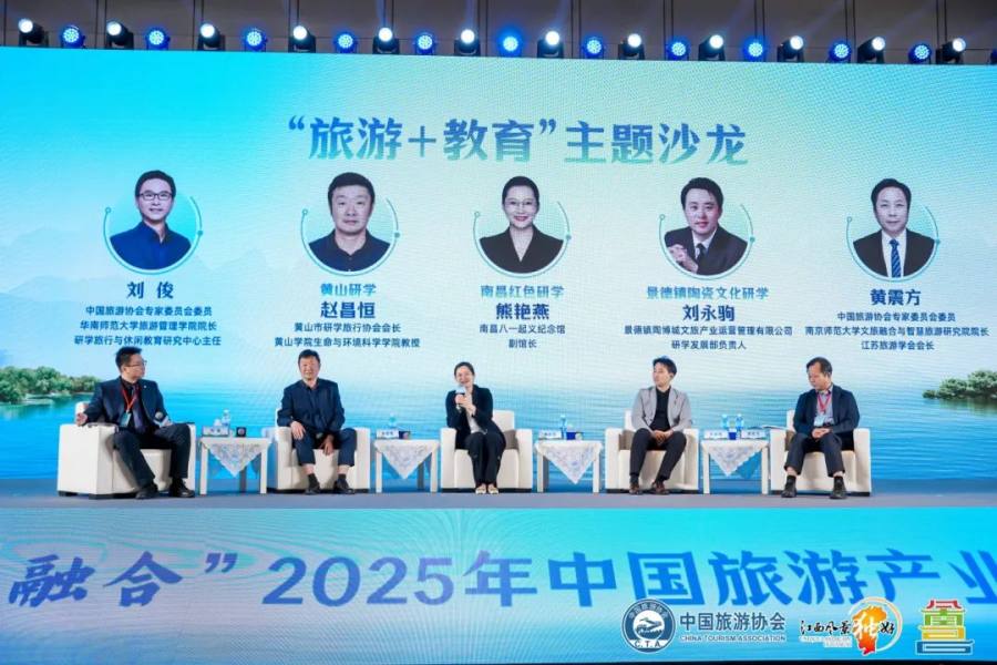 “旅游+教育”主题沙龙由中国旅游协会专家委员会委员,华南师范大学旅游管理学院院长、研学旅行与休闲教育研究中心主任刘俊主持。中国旅游协会专家委员会委员、南京师范大学文旅融合与智慧旅游研究院院长、江苏旅游学会会长黄震方,特邀案例分享人黄山市研学旅行协会会长、黄山学院生命与环境科学学院教授赵昌恒,南昌八一起义纪念馆副馆长熊艳燕,景德镇陶博城文旅产业运营管理有限公司研学发展部负责人刘永驹分别结合黄山研学、南昌红色研学、景德镇陶瓷文化研学等案例,讲述世界遗产、红色文化、非遗传承等核心特色,剖析实践背后的逻辑。
