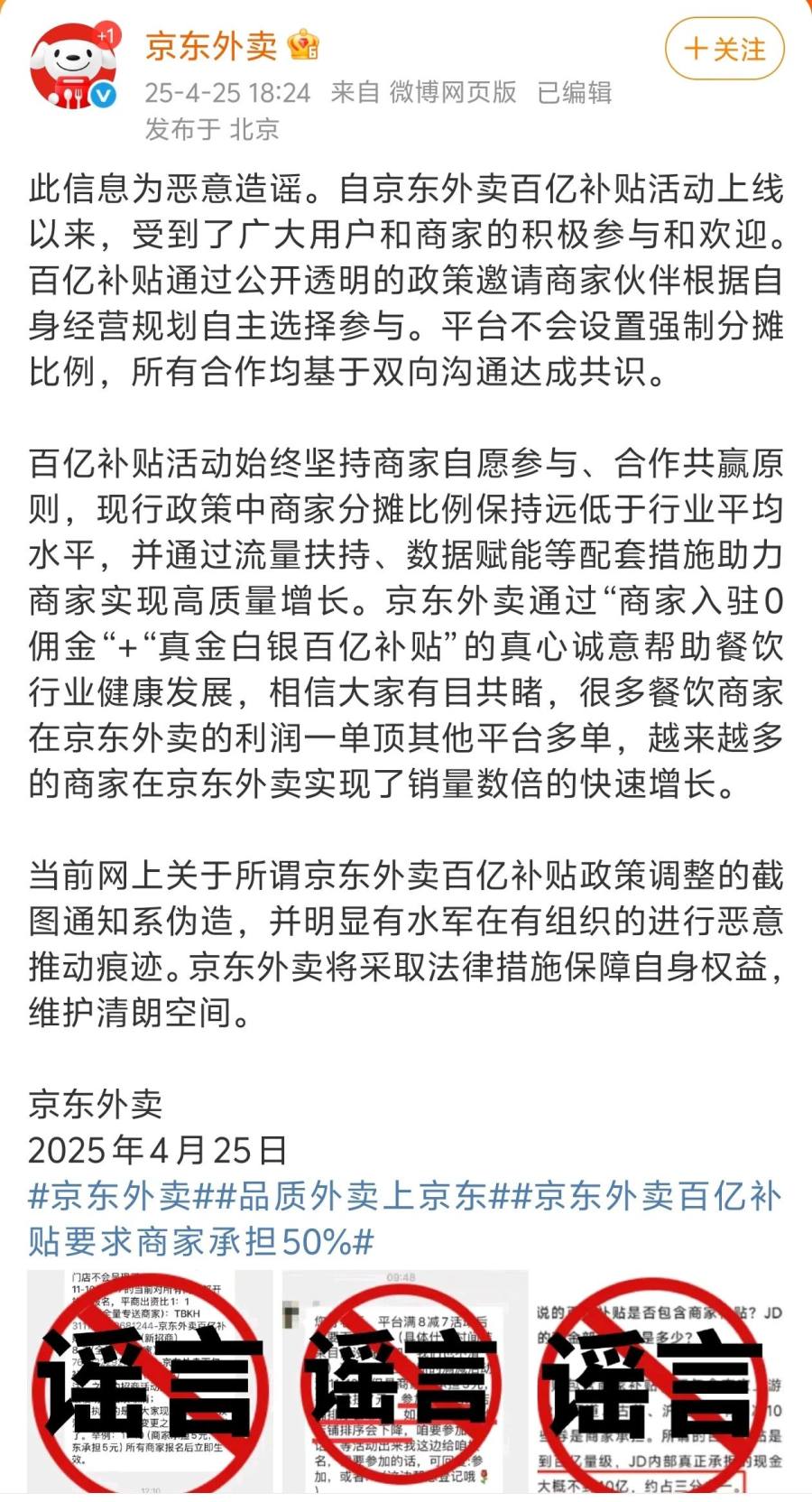百亿补贴商家要承担50%?京东外卖紧急辟谣恶意谣言