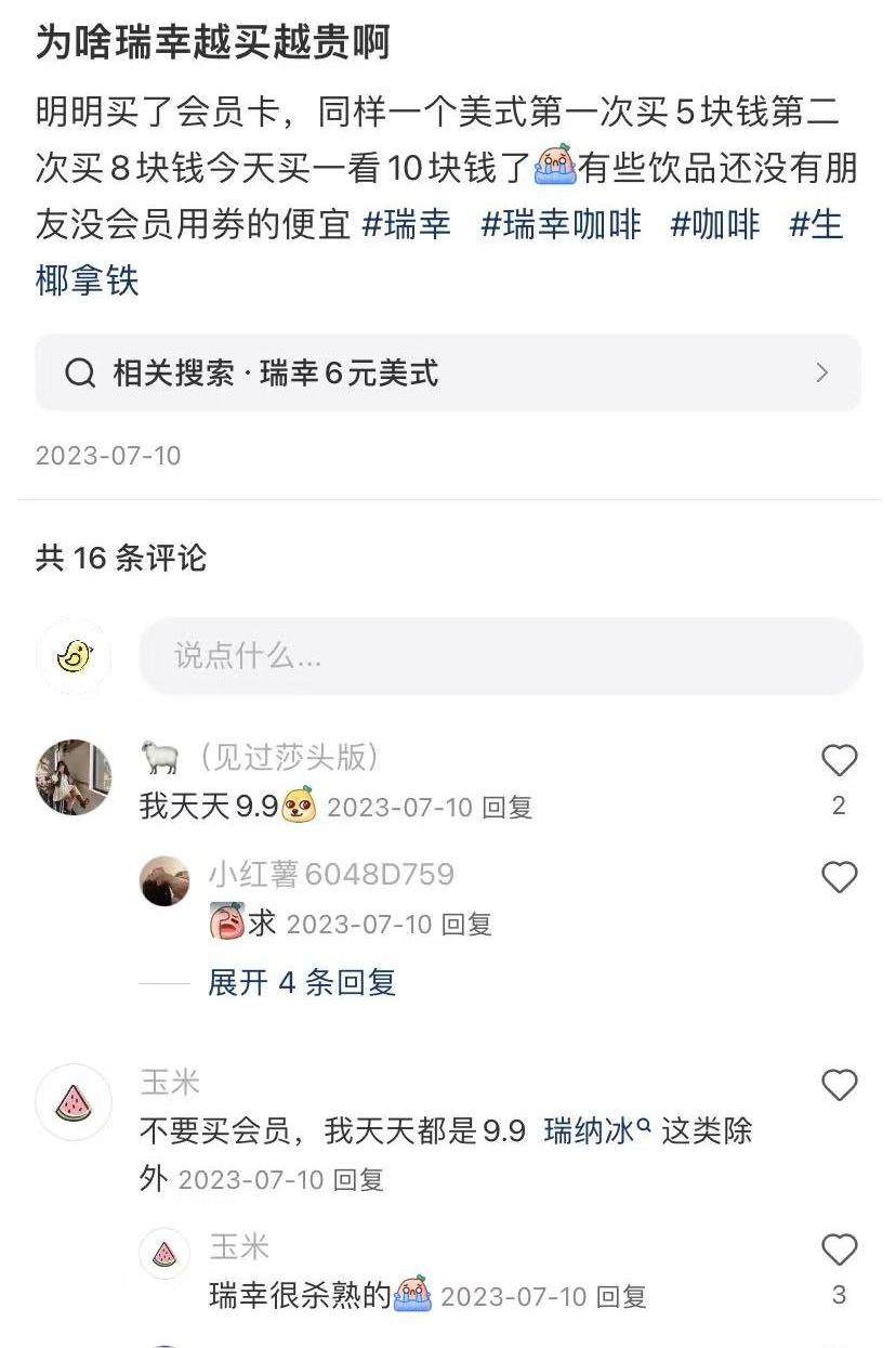 值得一提的是,社交平台上,一些网友也有同样的经历。有网友发帖表示,“明明买了会员卡,为啥瑞幸越买越贵?”“瑞幸直接下单和退出下单重新点有差价,这是为了留住客人吗?”“为什么不同的店瑞幸差价会这么大,少到两块,多到十一块”……