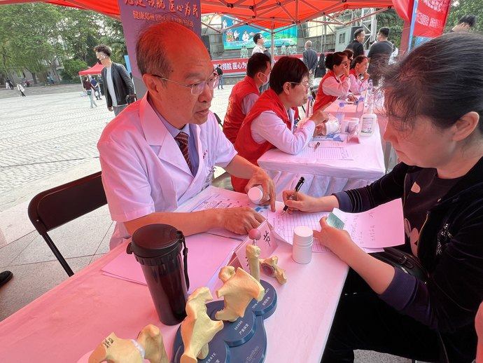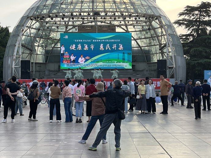 4月25日下午,在绿城广场东广场,全市“党建领航 医心为民”健康郑州文明实践志愿服务暨健康集市首场“集市”开场,来自郑州人民医院、郑州市骨科医院、郑州市第七人民医院、郑州市第二人民医院等19家医疗机构的60多位医疗专家齐聚,现场为前来参与活动的居民们解疑答惑;而在诊疗区,舒心活络操、八段锦、针灸、火龙罐、刮痧等中医诊疗项目齐全,吸引了众多慢性病患者及居民参与体验。