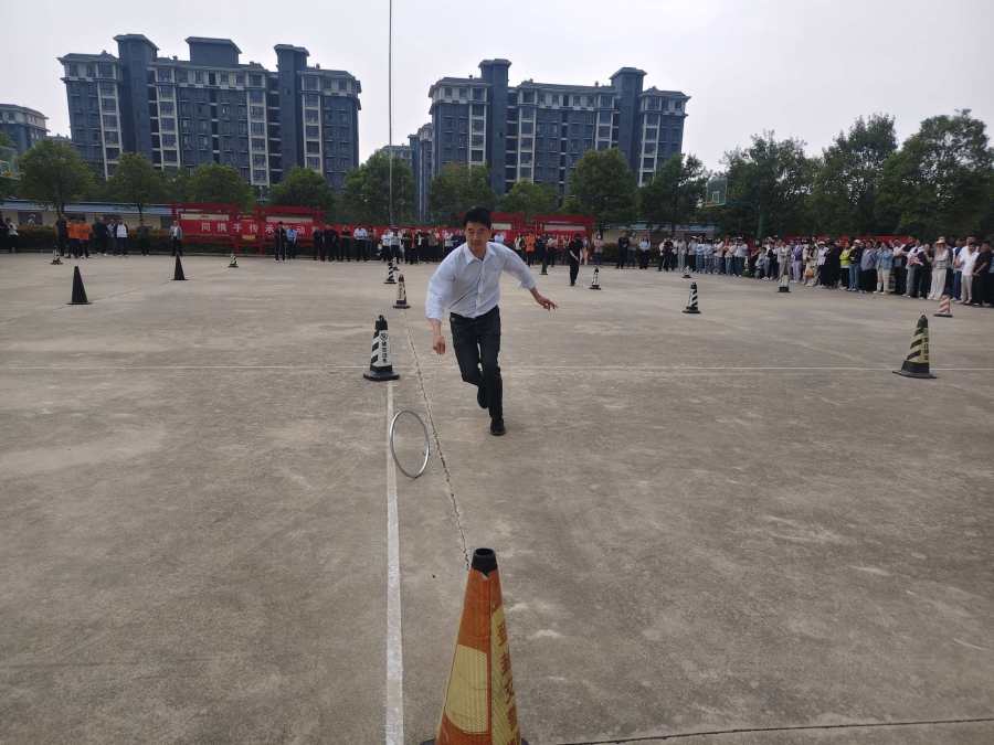 推铁环:传统技艺点燃竞技热忱首项“推铁环”比赛在篮球场率先开赛。60米赛道上,老中青三代选手同台竞技。铁钩与铁环碰撞的清脆声响中,老职工动作娴熟,铁环如飞轮般平稳疾驰;年轻选手初试生疏,屡次脱环后急追猛赶。赛道旁“稳住!别歪!”的提示声与掌声此起彼伏。