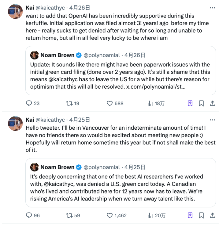 这个消息经由Kai Chen的同事、OpenAI的研究员Noam Brown的爆料而迅速引起科技界愤怒。Noam称Kai Chen为“最优秀的人工智能研究员之一”,称“一个在美国生活12年的加拿大人现在不得不离开”“令人深感担忧”。另一位同事则直呼“这简直是疯了”。
