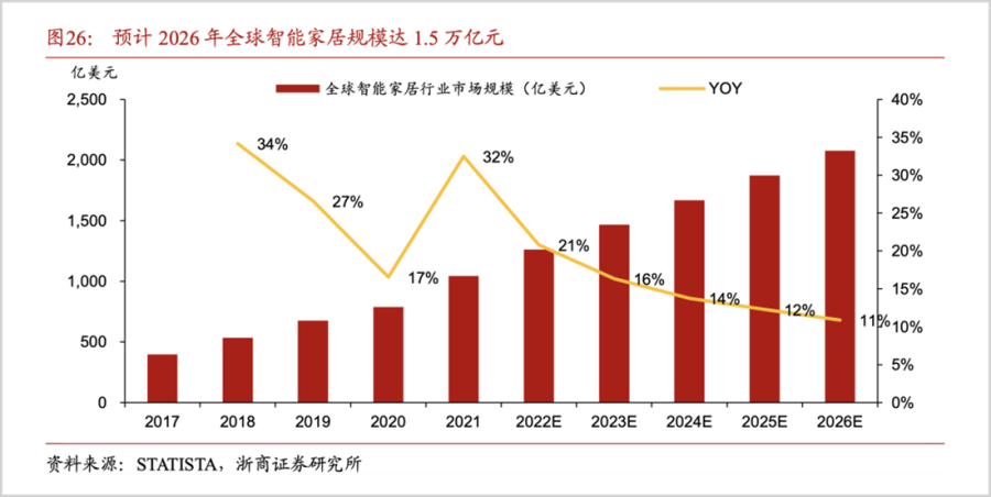 在5G+AIGC的赋能下,Statista预测到2026年,全球智能家居市场规模将突破2000亿美元大关,即1.5万亿元;国内智能家居市场规模将在2025年突破8500亿元,其中智能家电占比达80%。
