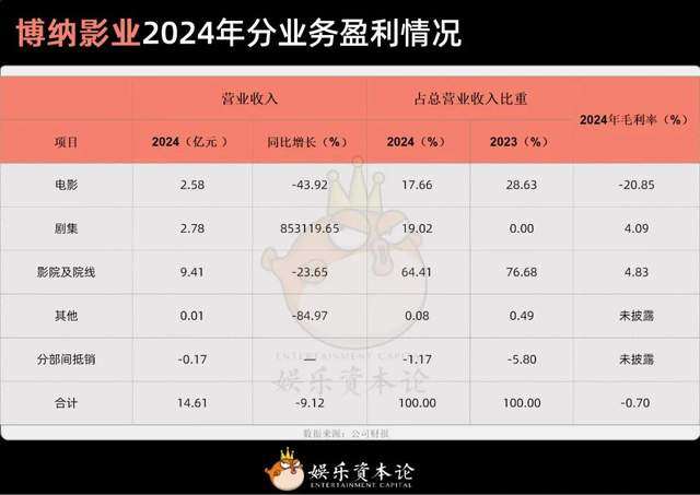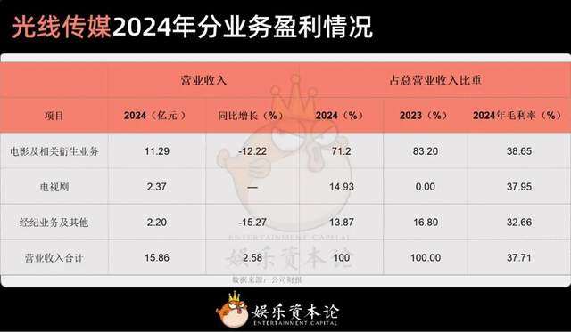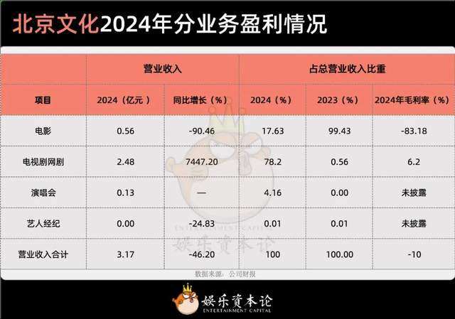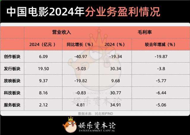 从同样握有核心发行资源的猫眼娱乐来看,猫眼的娱乐内容服务(包括发行和投资等)收入2024年下降14%;抛去电影及电视剧投资的公允价值收入(2024年收入27.5百万元,2023年亏损3.2百万元)影响,实际下降16%。