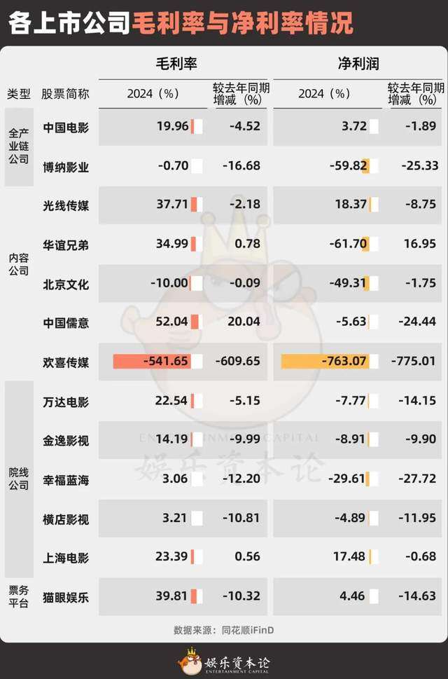 在内容公司中,只有光线、中国儒意保持了极小的营收增长,而华谊兄弟、北京文化、欢喜传媒的营业收入则下降了30.18%、46.20%、97.58%。华谊兄弟和北京文化甚至在2024年下半年毛利为负。这意味着二者下半年上映的《逆行人生》《志愿军:存亡之战》《749局》《异人之下》大概难以回本。
