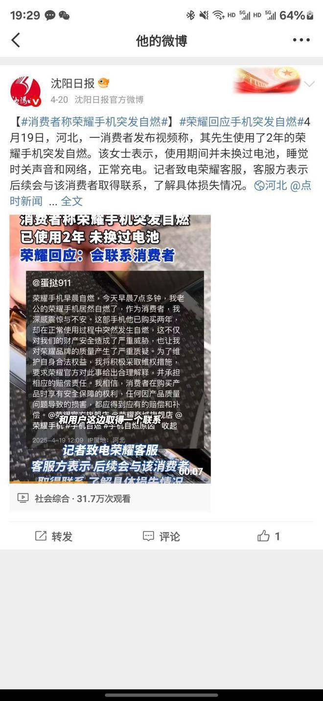手机自燃,这一事件本身就足以引起公众的恐慌和质疑。荣耀手机自燃的消息一出,立刻在网络上引发了轩然大波。消费者开始质疑荣耀的产品质量和安全性,而荣耀方面虽然表示将积极处理,但这一事件无疑已经对其品牌形象造成了不可估量的损害。在消费者心中,荣耀不再是那个值得信赖的品牌,而是一个存在安全隐患的“定时炸弹”。