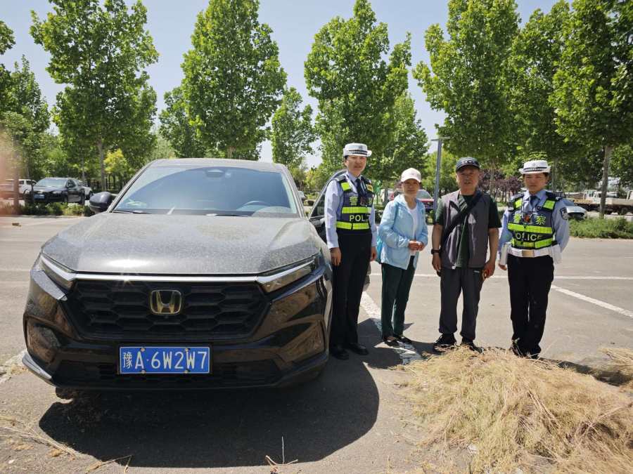 5月1日13时左右,中牟交警周磊、朱亚伟等人在牟山湿地公园南门口执勤中,一对60多岁的老夫妇向他们求助,称他们准备回家时,自己驾驶的汽车却怎么也找不到了。
