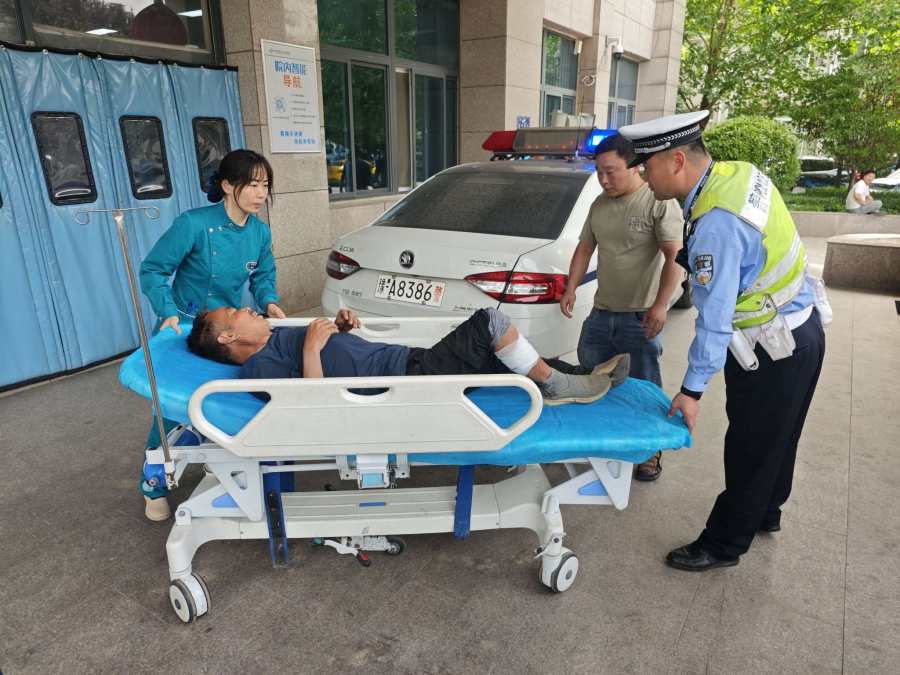 接指令后,正在执勤的中牟交警四中队民辅警王超、王志川等人立即赶至青年路与中兴路交叉口的事发现场。得知当事人是骑车不慎摔断了腿,在去医院的途中车辆突然熄灭,再也打不着火。急中生智,伤者家属就向110寻求帮助。
