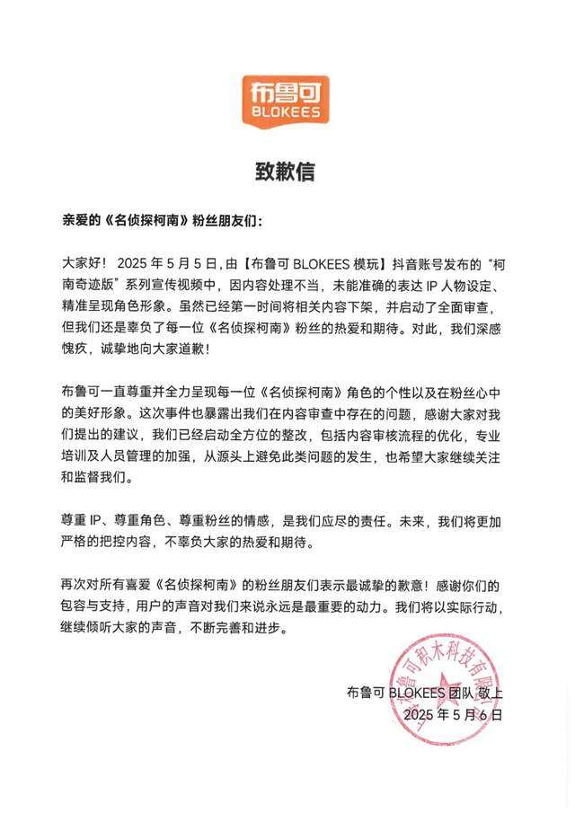 布鲁可官方看到了粉丝的不满。假期结束后第一天,布鲁可就在各种渠道发布官方声明,表示官方抖音账号的宣传视频内容处理不当,未能准确表达IP人物设定、精准呈现角色形象。布鲁可第一时间就已经下架了相关视频,并启动了全面审查。对此,他们深感愧疚,并将在今后的时间里优化审核流程,杜绝此类问题再次发生。