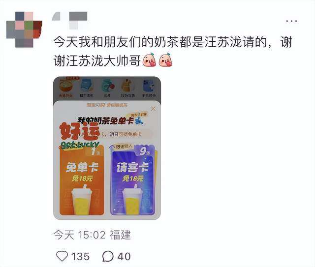 “今天我和朋友们的奶茶都是汪苏泷请的,谢谢汪苏泷大帅哥。”5月6日,“淘宝闪购”全量开放这一天,淘宝闪购推出1亿杯奶茶免单活动,签下汪苏泷和吴燕妮作为品牌大使,引发全网热议。