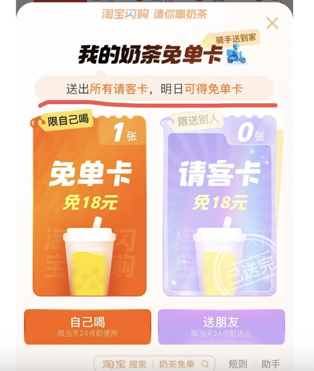 值得一提的是,淘宝闪购奶茶免单卡的社交营销玩法设置充满了“小心机”。抽到“免单卡”的用户不仅会收到外卖红包待使用时长的倒计时提示,还会被提醒“送出所有请客卡,明日可得免单卡”的标识。这套打法下来,将淘宝闪购奶茶免单卡的用户心智进一步夯实,激发用户持续点进淘宝闪购抢奶茶免单卡的动力,甚至将“请客卡”发展为亲朋好友间的新型社交货币。