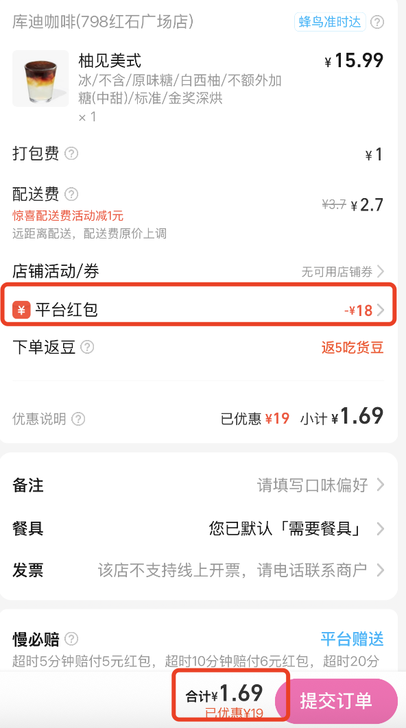 经剁椒Spicy体验,在淘宝闪购领取“免单卡”后,一杯售价15.99元的库迪咖啡,到手只需要1.69元,甚至都没超过2元的配送费。