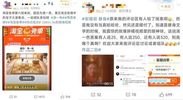 砸入真金白银补贴、官宣明星艺人代言之外,淘宝顺势将沉寂了一年的“淘宝答题免单”活动抬上了桌面,掀起了新一轮“答题免单”趣味游戏,该游戏引发的热度空前,5月7日晚间,#淘宝免单 #宛宛类卿#清一色#安陵容 替身等热搜词再次霸榜微博热搜榜单,#宛宛类卿#安陵容 替身的素材均出自经典影视剧《甄嬛传》。