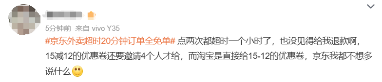 还有网友称,“点两次都超时一个小时了,也没见得给我退款啊15减12的优惠卷还要邀请4个人才给,而淘宝是直接给15-12的优惠卷,京东我都不想多说什么。”