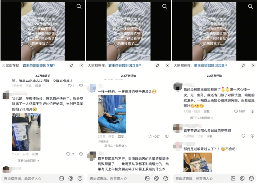 目前,这名网友的帖子已有超过2万条评论,很多网友都吐槽霸王茶姬饮品中咖啡因含量过高,从而导致饮用后身体出现不适、失眠,甚至也有网友称自己半夜挂急诊。