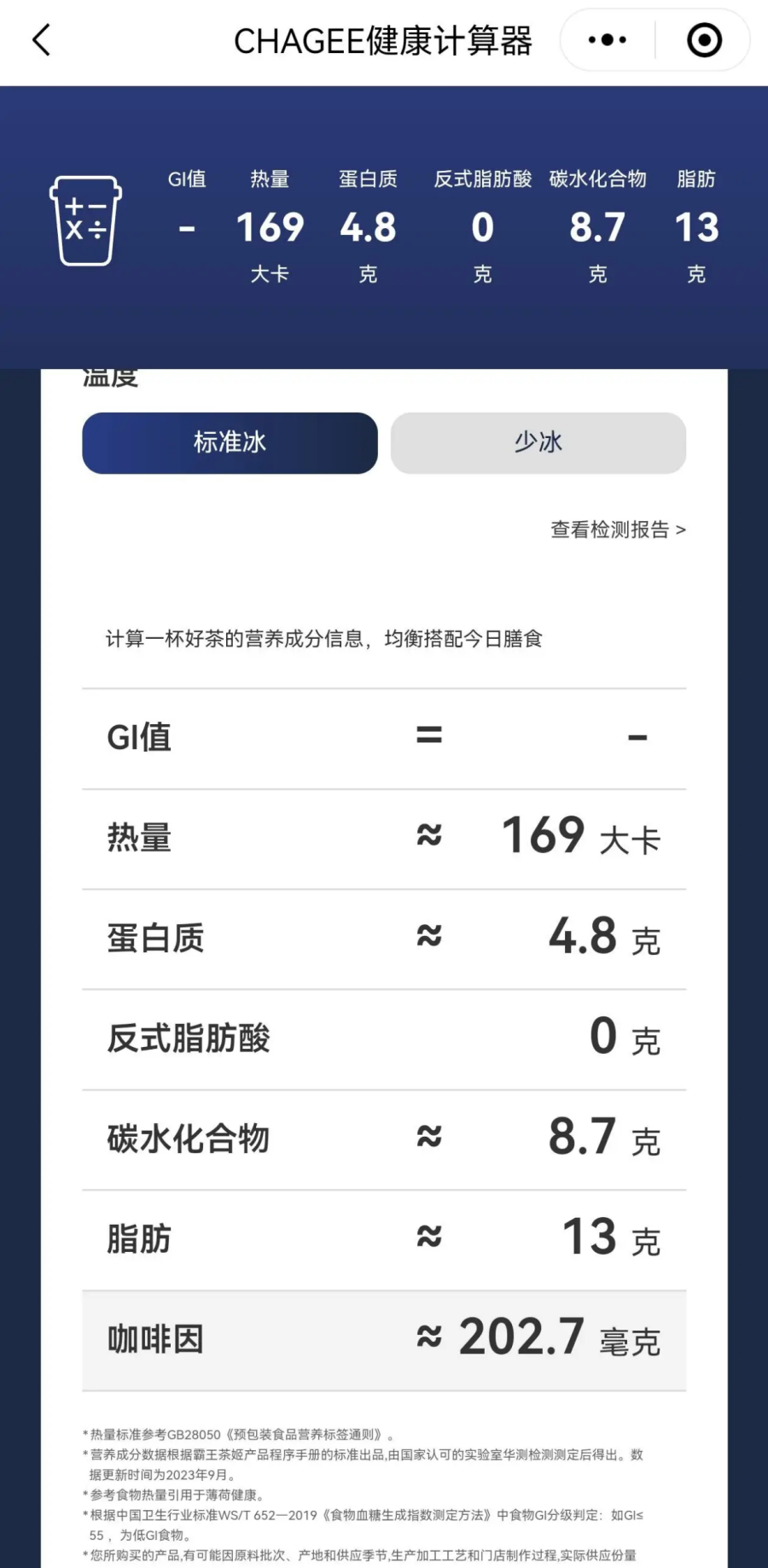 此外,茶姬小程序里有“健康计算器”,输入官方提供的数据可以看出,霸王茶姬大杯“万象春和”咖啡因含量高达202.7毫克,远超红牛(约37.5毫克/罐)和冰美式咖啡(约150毫克/杯)。