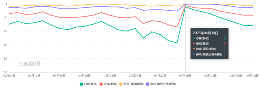七麦数据显示,《第五人格》近一年都是游戏畅销榜Top50常客,七周年之际甚至达到Top3,在王者和吃鸡之下。