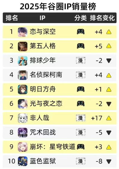 甚至在《2025闲鱼谷子趋势报告》上,《第五人格》周边销量仅次于乙游顶流《恋与深空》,成为年轻人最喜欢的游戏IP之一。