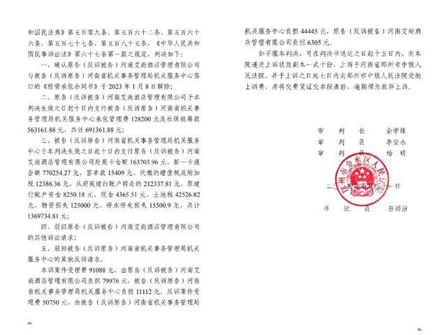 "实际上这是机关服务中心的上级部门对府苑饭店另有安排,无视法律做出的决定。随后,服务中心对府苑饭店进行换锁,停水停电封门,暴力驱赶我公司工作人员,我们没想到政府单位竟然还能这么干事。"胡辉气愤地说。 经公安机关多次出警协调也无法解决,无奈之下,2023年9月,艾尚酒店只能向郑州市金水区法院提起了诉讼。