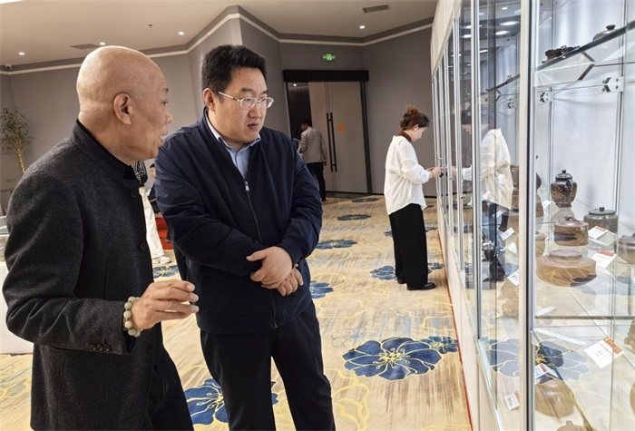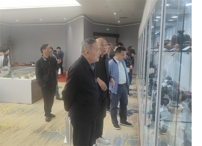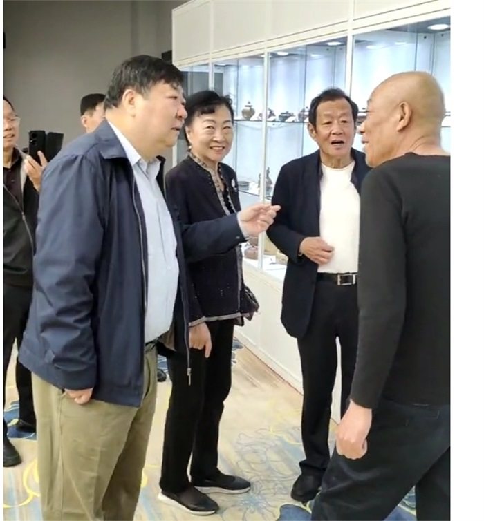 (紫砂鉴定专家王光辉为文旅部原副部长赵少华和中国收藏家协会刘铭威会长介绍紫砂大展藏品)
