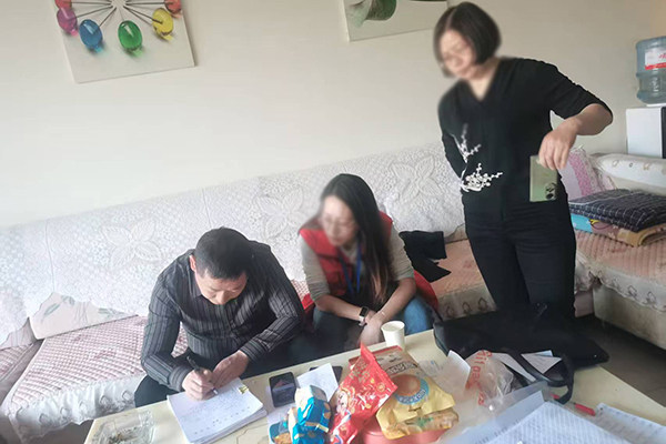 图:朱法官一边问话一边做笔录(左一)、中间网格员、右边为原告