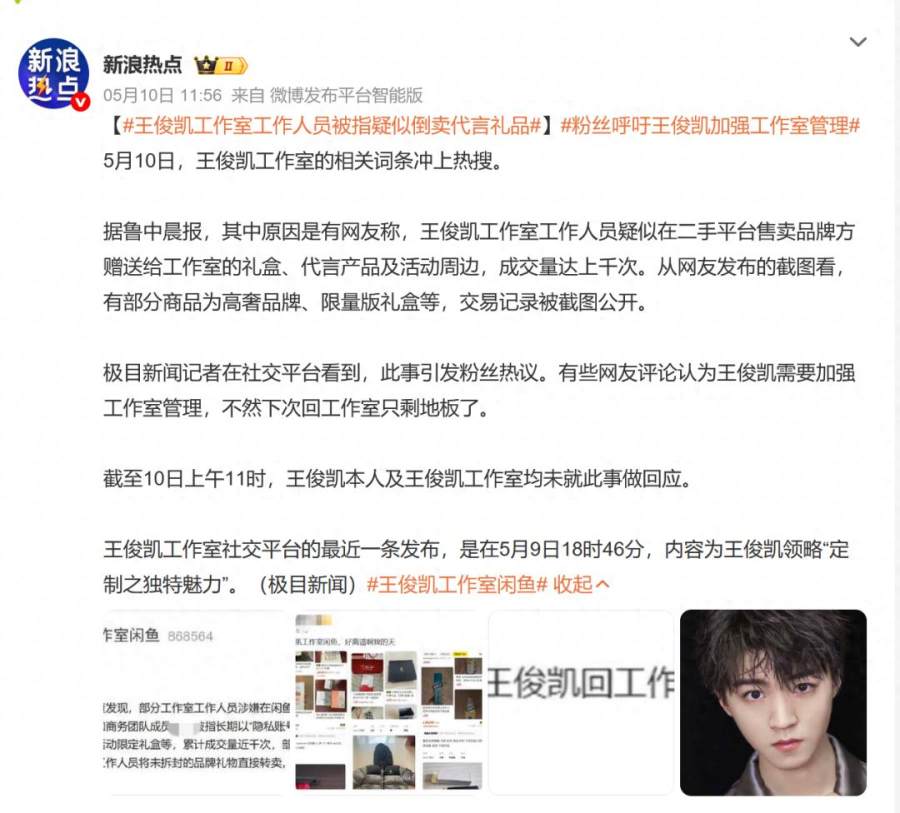 5月10日,有网友曝出王俊凯工作室员工长期在闲鱼倒卖品牌方赠品和代言物料,累计交易接近千次,部分售价高达数千元,引发舆情迅速发酵。粉丝群体反应强烈,直指工作室“管理失职、瞒上欺下”,要求彻查责任并重组团队。