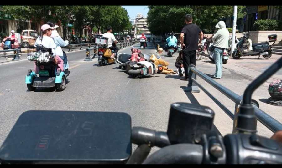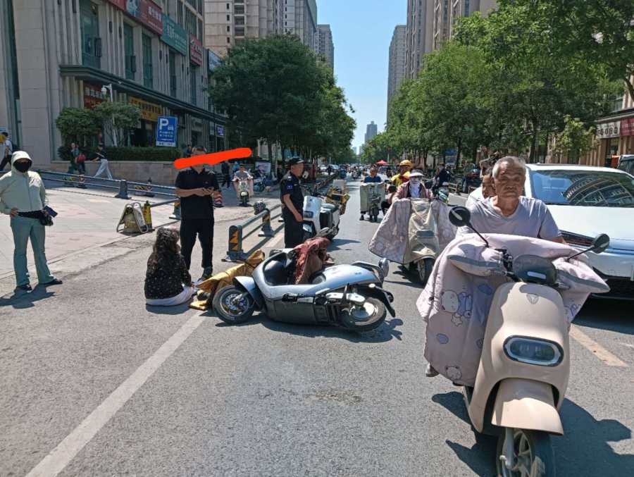 此时气温正高,老太太横坐在滚烫的马路上(马路中间),已满头大汗。郑州市红十字法律工作志愿服务队副队长李中洲恰好路过,他打开手机录像上前查看处理。一边亮明身份,询问概况,一边检查老人伤情(并未有明显外伤,老太太腿疼不排除内伤),让小伙子拍照固定现场,先把老人转移到安全阴凉处,确保老人健康(减少虚脱、中暑、二次伤害等危险)。由于路窄,加上两个事故电动车正好倒在马路中间,导致道路拥堵。