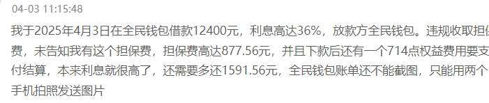 一用户在4月3日投诉,“2025年4月3日在全民钱包借款12400元,利息高达36%,全民钱包违规收取担保费,未告知我有这个担保费,担保费高达877.56元,并且下款后还有一个714元的权益费用要支付结算,本来利息就很高了,还需要多还1591.56元。”