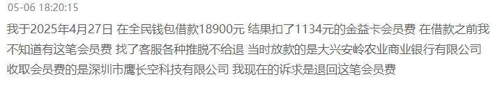 另一名用户反映,其于2025年4月27日在全民钱包借款18900元 结果扣了1134元的金益卡会员费,“在借款之前我不知道有这笔会员费,找了客服各种推脱不给退,当时放款的是大兴安岭农业商业银行有限公司,收取会员费的是深圳市鹰长空科技有限公司,我现在的诉求是退回这笔会员费。”